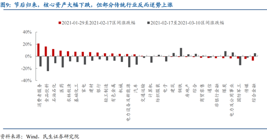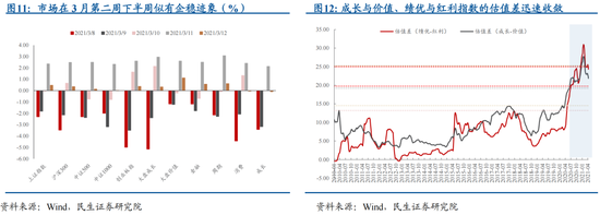市场特征:年后市场的连续下挫,终于在3月8日与3月9日以核心资产“崩盘”式的回调完成了最后恐慌情绪的释放,随后三个交易日核心资产与传统行业开始逐步反弹,市场似有企稳现象。在本轮市场急跌中,截至3月10日,主流宽基指数之中,春节后以来上证指数下跌8.14%,而受核心资产大幅回调影响,创业板指下跌21.59%;从风格切换视角来看,市场以另一种极端的形式实现了成长与价值、大盘与小盘之间的相对估值收敛,其中以高估值核心资产为代表的大盘成长指数下跌21.44%,而大盘价值仅仅下跌3.03%。而在核心资产内部,性价比的重估也在发生:节后以来,低PEG,高性价比的核心资产的市场表现明显强于高PEG,低性价比的核心资产;而2021年从 ROE 视角预期收益率高(过去两年收益率超ROE水平低,2021年预期 ROE 较高)的核心资产并未产生明显回调,甚至上涨,展现出了更强的韧性。