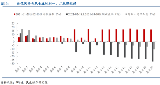 对于基金表现而言:节前(2021-01-29至02-10)偏股型基金指数区间收益率为7.73%,而主动偏股型基金区间收益率均值/中位数为20.38%/6.34%,跑赢偏股型基金指数的占比为38.07%;节后(2021-02-18至03-10)偏股型基金指数区间收益率为-16.42%,而主动偏股型基金区间收益率均值/中位数为0.95%/-14.28%,跑赢偏股型基金指数的占比为61.89%。有意思的是在市场下跌时跑赢偏股型基金指数的基金反而占比更大。同时我们发现,节前排名前十的偏股型基金均集中于消费类基金,节后均遭遇了大幅回撤;而节后排名前十的偏股型基金均集中于价值风格类基金,并非所有基金节前表现都很差。如果将这两个区间收益率加总,则我们发现还是价值风格类基金在时刻一、二表现较好。