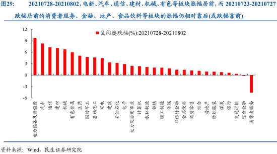 基本面情况与市场特征:7月28日盘初,沪深300出现较大幅度下行的同时伴随着北上较大幅度的买入,沪深300指数也因此企稳而逐步回升,结合当日沪深300走势与北上整体净流入走势来看:北上资金似乎充当了当日的“维稳”力量。从交易席位来看,北上交易盘是当日净买入的主力,北上配置盘则未见明显回流,但流出也有所放缓。行业上,北上配置盘净卖出的板块基本延续前两个交易日(0726-0727)的选择,而北上交易盘的选择则出现了明显的变化。这意味着7月28日当天北上确实可能出现了与过去一段时间不同的参与者,这也成为市场阶段企稳反弹的起点。往后看,北上配置型资金逐步企稳回流,前期(20210723-20210727)卖出较多的食品饮料、电新、建材、地产等板块逐步迎来资金回流。从涨跌幅层面看,电新、汽车、通信、建材、机械、有色等板块涨幅居前,但20210723-20210727跌幅居前的消费者服务、金融、地产、食品饮料等板块的涨幅仍相对靠后(或跌幅靠前)。