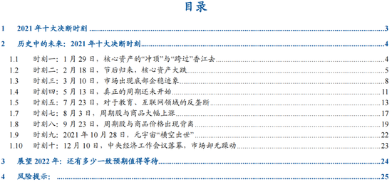 不变的是不确定性本身,然而在每次面临不确定性时所做出的抉择背后必然有我们对于最终可能出现的结果的概率判断,这个判断的过程其实就是从输入x到输出f(x)的过程,这种映射关系必然要经过校验,这样才能够不断改善我们在面临不确定性时命中的概率。因此我们基于事件的重要性以及对市场的影响程度,筛选出了2021年A股的十大决断时刻,试图尽可能地还原当时做出决策时所能掌握的信息,以市场后续的表现作为参照组,对当时可能的选择进行校验,从而为后续的判断提供一定的经验与帮助。