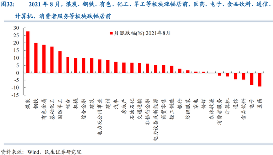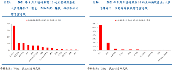市场观点总结与后续验证:在当时市场13家主流机构中,8家机构均认为“双减”以及互联网反垄断等会对市场产生短期阵痛,从行业配置推荐来看,其中,6家仍选择看好上述以居民和大众为最终购买方的板块部分板块(如医药、食品饮料等);新能源产业链(新能源车、光伏等)以及半导体是12家机构共同力推的板块;对于周期板块,有5家机构推荐化工、有色等板块,而钢铁、煤炭则仅有1家机构选择力推。往后看,2021年8月,煤炭、钢铁、有色、化工、军工等板块涨幅居前,医药、电子、食品饮料、通信、计算机、消费者服务等板块跌幅居前。这意味着:市场一致推荐的新能源产业链、半导体等板块表现并不靠前,而上述仍被6家机构看好的大消费板块(医药、食品饮料、消费者服务等)整体表现不佳,与之相反的是,仅被市场1家机构力推的煤炭、钢铁板块反而领涨市场。对于主动偏股基金而言,2021年8月整体明显跑输中证800指数,比例上,62.39%跑赢沪深300指数,41.53%跑赢中证800指数,而从行业配置来看, 2021年8月业绩排名前10的主动偏股基金,大多选择化工、有色、石油石化、煤炭、钢铁等板块作为重仓股,而业绩排名后10的主动偏股基金,大多选择电子、医药等等板块作为重仓股。