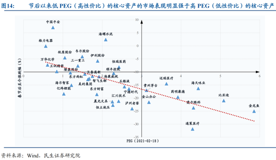判断逻辑:从跨年行情走向春季躁动正在成为当时市场的共识,但这种一致预期可能已经被2020年11月以来的两类交易行为所定价:11月,由于至少1季度经济本身没有问题,伴随疫苗推出买入经济复苏;12月,由于相信1季度市场没问题,因此利用年底和基本面的有限变化加仓新能源和白酒。对于远期观点的一旦形成共识,就会贴现到当下资产价格中,这构成了一致预期往往错误的原因。但一致预期也曾正确,即增量资金涌入的市场,特别是趋势追逐资金涌入的市场,可以让市场投资者的观点的表达可以得到强化。但根据历史经验指示,在公募重仓股12月大幅跑赢市场后,在随后1季度的收益往往为负,公募基金业绩整体也不佳。在这样的环境下,要理解过去居民入市一定程度来自于基金的赚钱效应,如果基于过去2年的短期靓丽数据线性外推分析居民长期入市的过程可能是不可取的。一旦市场赚钱效应减弱,机构负债端出现波动的可能性将上升。因此,现实情况看,当时市场对于春季躁动的一致预期出错概率较大。站在当时,市场可以做出的选择是:持币过节或者提前调整结构。