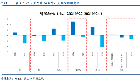基本面情况与市场特征:大宗商品价格进入加速上涨的阶段,但周期板块股票反而出现了回调。由于“双碳”目标的存在,2021年下半年能耗“双控”形势严峻,尤其是一些上半年能耗强度不降反升的省份更是有政策频繁出台,以石化、化工、煤化工、焦化、钢铁、建材、有色、煤电等“双高”行业为重点,推进能耗双控目标完成,在这一情形下,各类大宗商品价格出现明显上涨。尤其是在9月23日,动力煤期货价格跳涨,创历史新高(1168元),但当日煤炭股票板块却创下1.49%的跌幅,并从此开始连续调整。这一现象不仅发生在煤炭上,我们统计了9月22日至9月24日这三天的市场行情,在有色(铜、铝)、纯碱、钢铁等板块,也同样出现这样的特征:周期股跑输商品。