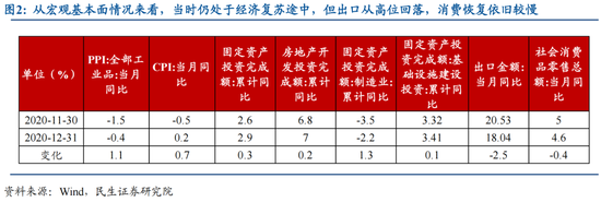 基本面情况与市场特征:从宏观基本面数据来看,2020年12月相较于11月而言仍处于经济复苏途中,物价水平仍在上行,而投资也在继续恢复,美中不足的是出口从高位回落,消费恢复依旧较慢。从风险溢价来看其实当时的A股已经不那么便宜,全部A股的股债风险溢价已经接近2018年1月底的水平,但“不那么便宜”背后其实是十分极致的分化:从CAPE的角度来看,以创业板指和大盘成长指数为代表的成长风格指数的CAPE已经突破历史+2倍标准差,而以大盘价值为代表的价值风格指数CAPE甚至仍处于历史均值下方。从流动性环境来看,由于跨年效应,时刻一面临的流动性其实较为紧张,无论长短端利率都有所上行,尤其是短端利率。同时由于2020年11月社融继续回落,因此市场上也有不少担忧信用走弱对于经济复苏的不利影响,因此也有部分投资者在期待节后利率的下行。