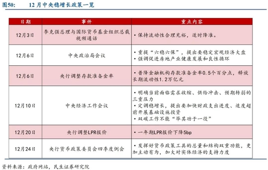 基本面情况与市场特征:经济下行压力增加,中央定调稳增长。三季度以来,经济下行压力逐步显现。从经济动能的角度来看:投资端,制造业投资、房地产投资与基建投资增速均在下行;消费端,社零同比增速明显弱于疫情以前;出口端虽仍有韧性,但增速已开始放缓。与此同时,PPI同比增速仍处高位且向CPI的传导并不顺畅,工业增加值增速明显弱于疫情前,社会融资需求走弱。12月以来,在中央经济工作会议召开之前,12月6日政治局会议已重提“六稳六保”,同时强调要“稳定宏观经济大盘”;央行随后全面调降金融机构存款准备金率0.5个百分点,释放流动性1.2万亿元。