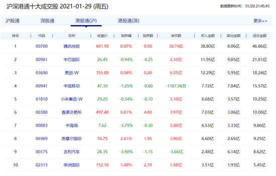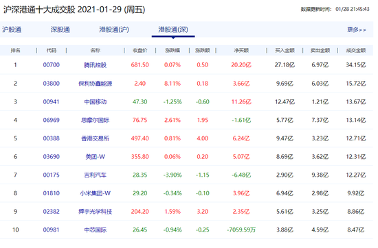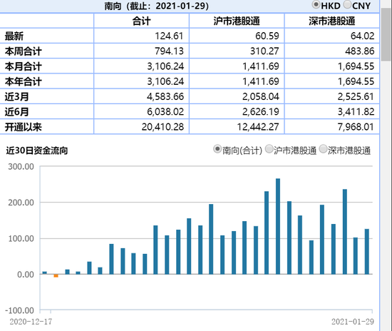 1月29日消息 ,南下资金今日净流入124.61亿港元,腾讯获买入50.94亿港元,美团获买入11.42亿港元,中国移动获买入11.14亿港元,港交所获买入10.21港元。