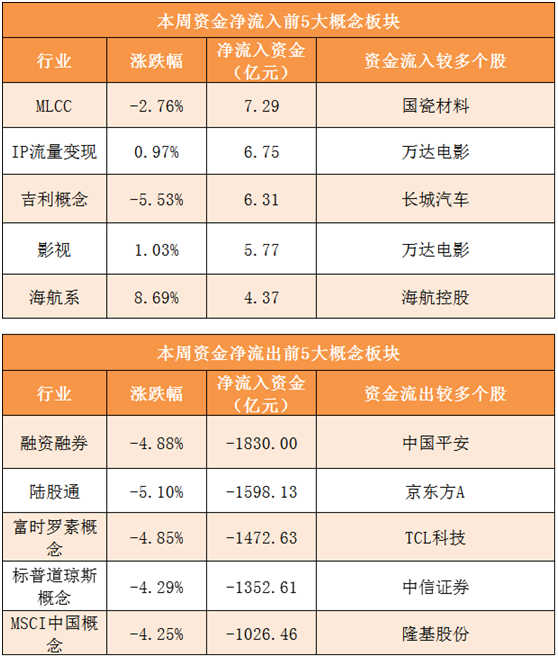 概念板块方面,概念板块方面,本周MLCC、IP流量变现、吉利概念、影视等概念板块资金呈现净流入,其中MLCC概念净流入7.29亿元居首。