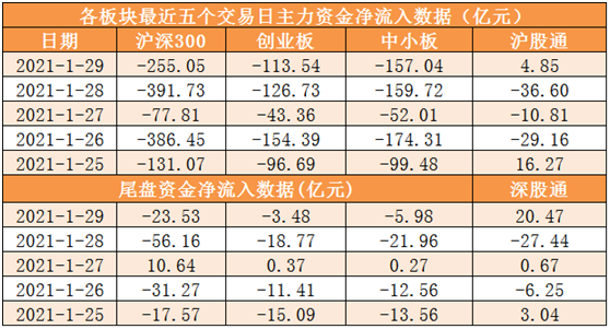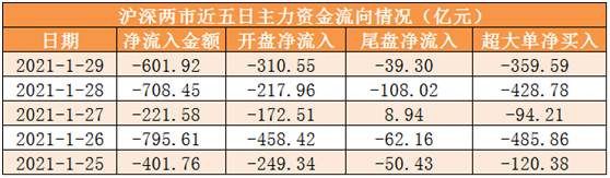 本周两市主力资金累计净流出2729.33亿元。其中周五(1月29日)主力资金开盘净流出310.55亿元,尾盘净流出39.3亿元,全天净流出601.92亿元。