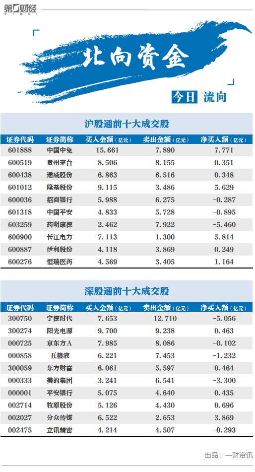 前十大成交股中,净买入额居前三的是中国中免、长江电力、隆基股份,分别获北向资金净买入7.77亿元、5.81亿元、5.63亿元。