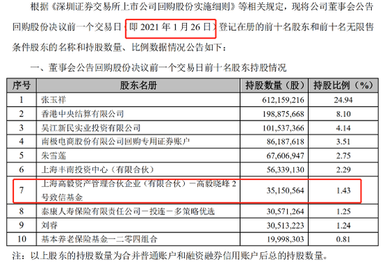 基金君发现,南极电商公布的关于回购股份事项前十名股东的名单里面,上海高毅资产管理合伙企业(有限合伙)-高毅晓峰2号致信基金位列第七大股东,持有3515.06万股,持股比例为1.43%。如果按照最新的股价9.59元/股算,高毅晓峰2号致信基金的持股市值为3.37亿元。