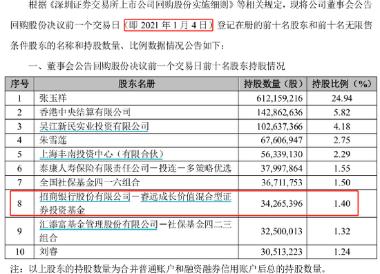 但基金君也留意到,1月6日公布的前十大股东名单中有睿远基金旗下的睿远成长价值混合型基金,该基金持有3426.54万股,持股比例为1.40%。该基金由睿远基金傅鹏博、朱璘管理,最新规模高达271.56亿元。该基金也是新进的南极电商前十大股东,但是到了第二次回购公布前十大股东时,睿远成长价值基金已经退出。