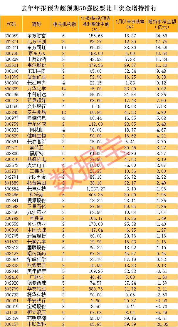 业绩超预期股也多吸引了资金的注意数据显示,按照1月以来成交均价粗略计算,年报超预期50强9月以来获得北上资金增持接近183亿元。其中,北上资金1月以来增持东方财富近亿股,按照1月以来该股36.04元成交均价计算,增持金额超过34亿元居首。此外,北上资金增持北方华创超过17亿元位居次席,增持东方雨虹、京东方A、山西汾酒、韦尔股份等个股均超过10亿元。