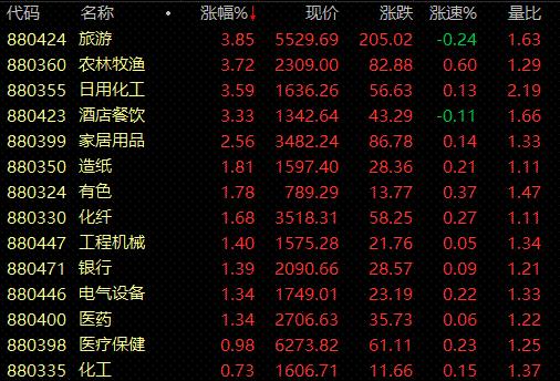 连续两个交易日反弹后,今天早盘两市出现震荡上扬。截至上午收盘,上证指数上涨0.2%,创业板指上涨1.3%。板块方面,旅游、农林牧渔、日用化工等板块涨幅居前,运输设备、交通设施、半导体等板块跌幅居前。