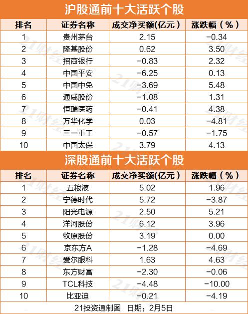 今日十大活跃个股方面,洋河股份、宁德时代、五粮液、中国太保净买入居前,分别获净买入6.12亿元、5.72亿元、5.02亿元、3.79亿元;中国平安、TCL科技、中国中免净卖出居前,分别获净卖出6.25亿元、4.48亿元、3.69亿元。
