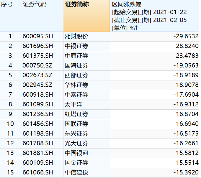 期间累计跌幅超10%的券商股有32只,超15%的有15只,超20%的有3只,分别是湘财股份(29.65%)、中银证券(28.82%)、中原证券(23.48%)。