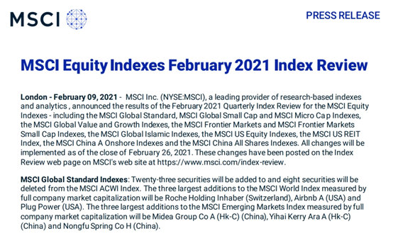 2月10日早上,明晟公司(MSCI)公布今年二月的季度指数审阅结果,所有的调整将会在2月26日收盘后实施。调整具体结果如下: