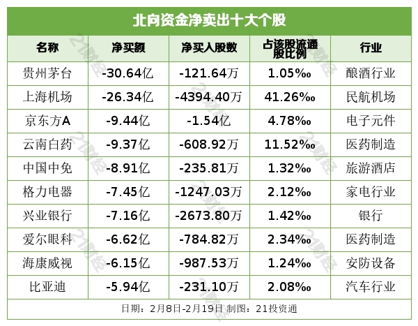 北向资金净卖出贵州茅台(600519.SH)、上海机场(600009.SH)、京东方A(000725.SZ)、云南白药(000538.SZ)、中国中免(601888.SH)居前,金额分别为30.64亿元、26.34亿元、9.44亿元、9.37亿元、8.91亿元。
