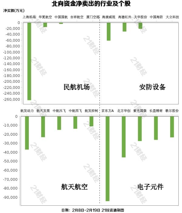 北向资金共减持18个行业,其中民航机场最多,净卖出金额达25.00亿元,其次是安防设备,净卖出11.40亿元。