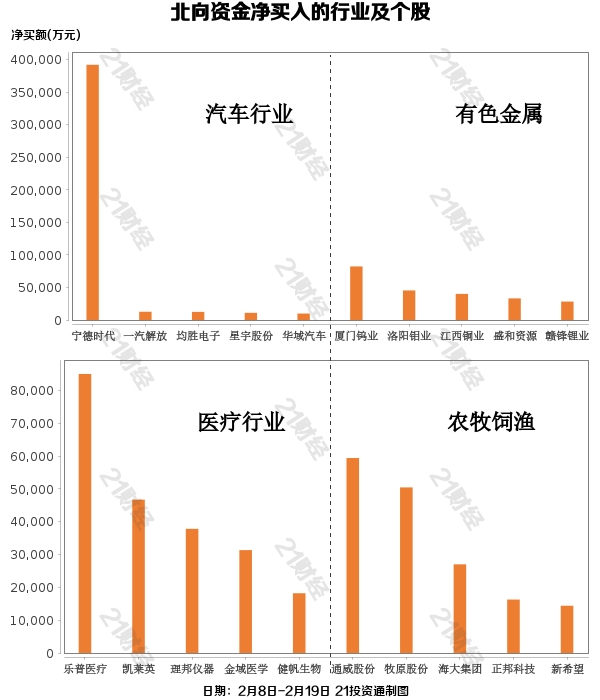 尽管行情分化明显,北向资金依旧活跃。据21投资通(微信号ID:touzit21)智能监测,2月8日-2月19日,北向资金合计净买入233.99亿元,其中沪股通净买入61.56亿元,深股通净买入172.43亿元。由此可见,外资对A股市场依然乐观,积极做多。