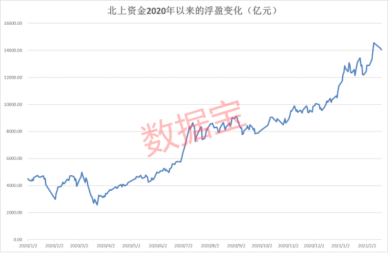 进入2021年以来,北上资金的累计浮盈快速增长,2月10日累计浮盈高达1.46万亿,创下历史新高,相比3个月前增长49.24%。最新浮盈金额为1.41万亿,已连续3个交易日稳定在1.4万亿以上。
