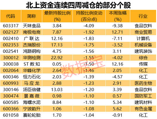 北上资金连续4周卖出69股。分行业来看,医药生物行业个股数量居前,有8只。从持股比例变动情况来看,与4周前相比,15股减仓比例超1%。天味食品减仓幅度最大,相比4周前减仓了4.09%,其他减仓幅度较大的还有南极电商、广联达、杰瑞股份、鸿路钢构等。