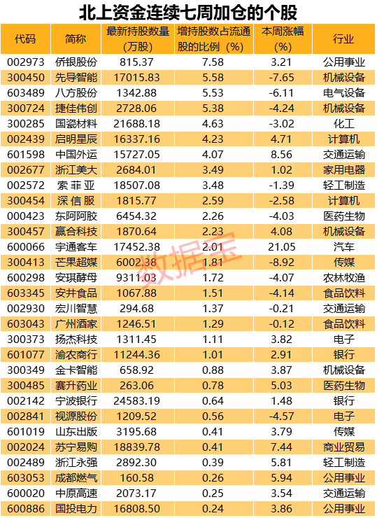 北上资金连续四周买入150股。分行业来看,计算机行业个股较多,有15只。将时间拉长,30股被北上资金连续7周加仓。从持股比例变动情况来看,侨银股份获加仓幅度最大,较7周前增持股数占流通股的比例为7.58%;其他连续加仓的还有先导智能、八方股份、捷佳伟创等。