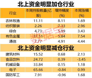 证券时报·统计显示,本周北上资金持股数量环比增加行业26个。农林牧渔、纺织服装、综合、有色金属等行业持股数量增幅靠前。其中,农林牧渔行业增加最为显著,最新持有该行业11.11亿股,环比增加8.11%。从市场表现来看,有色金属行业本周涨幅最大,上涨7.54%,加仓幅度最大的农林牧渔板块本周上涨1.69%。