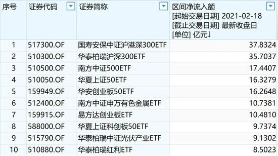 Wind数据显示,春节以后,截至2月24日收盘,从资金净流入排名前10名来看,分别为:国寿安保中证沪港深300ETF(2月24日上市)、华泰柏瑞沪深300ETF、南方中证500ETF、华夏上证50ETF、华安创业板50ETF、南方中证申万有色金属ETF、易方达创业板ETF、华夏上证科创板50ETF、华泰柏瑞中证光伏产业ETF、华泰柏瑞红利ETF。