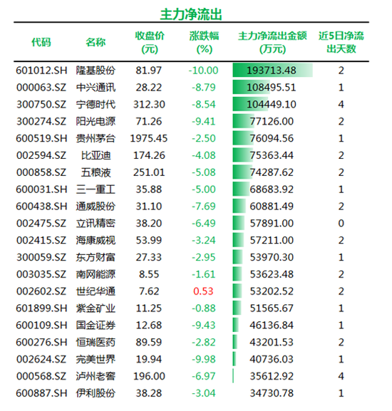 今日主力资金净流出居前的个股包括,隆基股份、中兴通讯、宁德时代、阳光电源、贵州茅台、比亚迪、五粮液等。