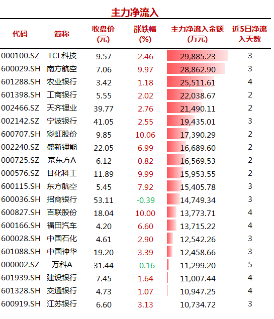 今日主力资金净流入居前的个股为,TCL科技、南方航空、农业银行、工商银行、天齐锂业、宁波银行等。
