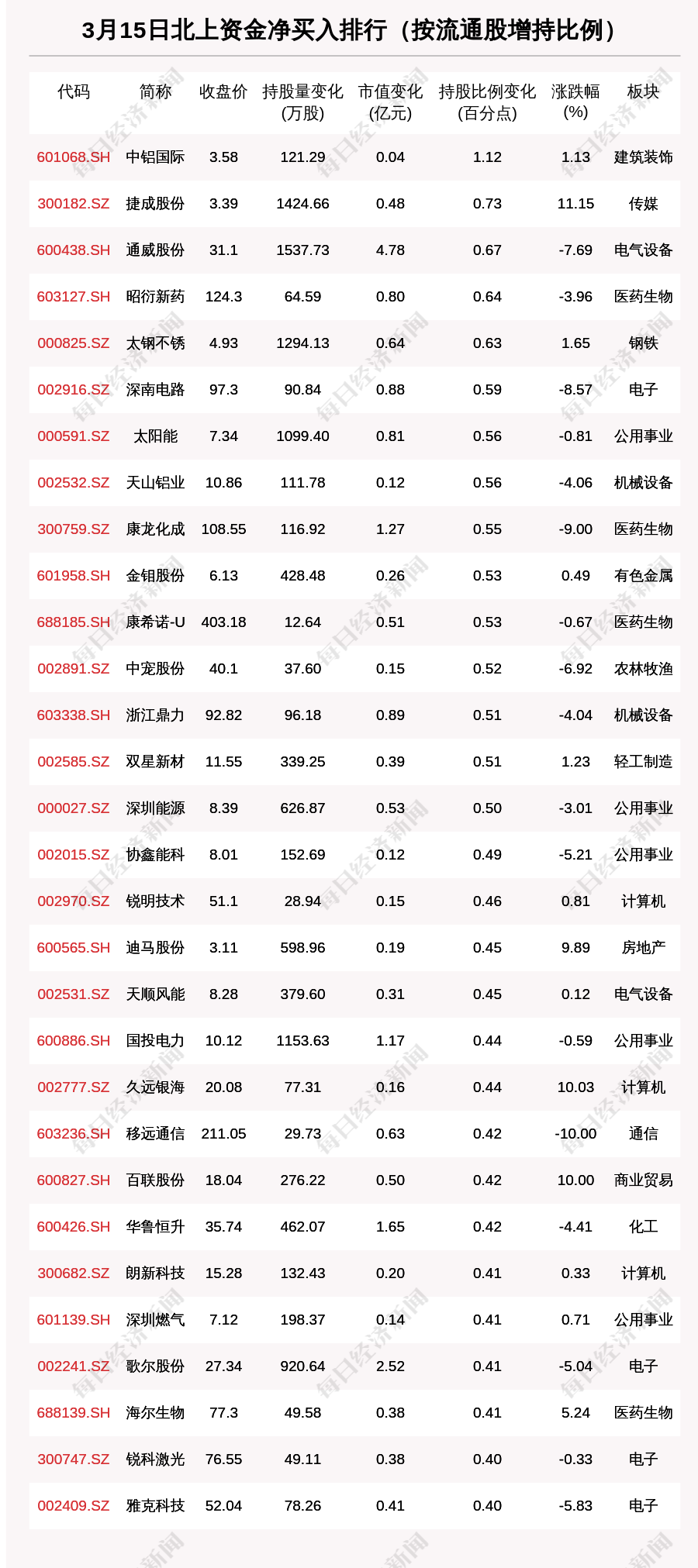 每经AI快讯,3月15日,北上资金净买入的个股共有692只,北上资金加仓比例超1%的有599只。其中,中铝国际(601068.SH,收盘价:3.58元)加仓比例最为明显,最新持股比例17.87%,环比增加1.12个百分点。其他北上资金加仓比例较多的个股还包括捷成股份(300182.SZ,收盘价:3.39元)、通威股份(600438.SH,收盘价:31.1元)、昭衍新药(603127.SH,收盘价:124.3元)。