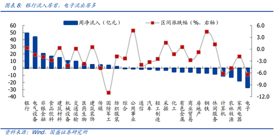 从资金性质拆分看,交易盘主要流入银行、非银金融和电气设备行业,分别净流入29.72亿元、11.98亿元和10.66亿元;同时集中流出化工、电子和计算机行业,分别净流出32.87亿元、19.18亿元和15.01亿元;配置盘主要流入电气设备、化工和银行行业,分别净流入32.11亿元、26.93亿元和19.39亿元;主要流出家用电器、汽车和电子行业,分别净流出14.83亿元、7.98亿元和6.85亿元。