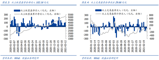 北上重回流入,交易盘流出明显放缓。上周北上净流入66.14亿元,南下资金净流出39.22亿元。根据我们对陆股通资金的拆解和估算,北上配置盘继续大幅净流入102.16亿元,随着上周市场小幅反弹,交易盘流出幅度也明显收窄,净流出29.66亿元。配置盘和交易盘今年以来累计净流入分别达到909.17亿元和16.24亿元。上周主板位回落,创业板和科创板仓位上升,截至3月12日,陆股通主板、创业板、科创板持仓比例分别为87.03%、12.89%以及0.08%。