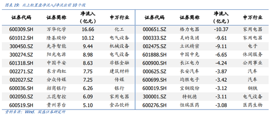 从配置盘角度看,上周配置盘净流入前五大个股依次为:万华化学、隆基股份、先导智能、阳光电源、中国平安,分别净流入16.66亿元、10.12亿元、9.44亿元、8.98亿元、8.63亿元;上周配置盘净流出前五大个股依次为:格力电器、美的集团、立讯精密、中国中免、长江电力,分别净流入10.37亿元、9.61亿元、9.11亿元、6.65亿元、4.24亿元。
