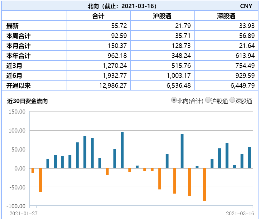 截至3月16日收盘,北向资金已连续6个交易日净买入A股,本周及3月以来的净买入金额分别为92.59亿元和150.37亿元。