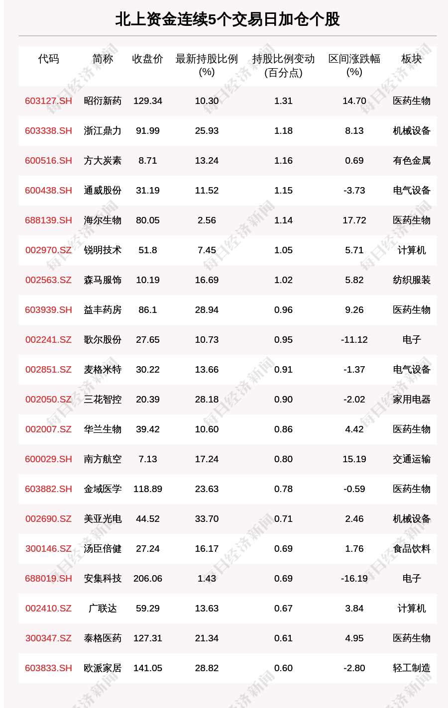 原标题:揭秘北上资金:连续5日加仓这72只个股,浙江鼎力、方大炭素、通威股份等增持比例排名靠前(附名单)
