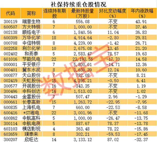 社保连续重仓股年内股价涨多跌少,瑞普生物涨近44%居首,方大特钢、顺络电子、万华化学、中信特钢、利尔化学等个股均涨逾20%。跌幅最大的是欣旺达,跌超30%。