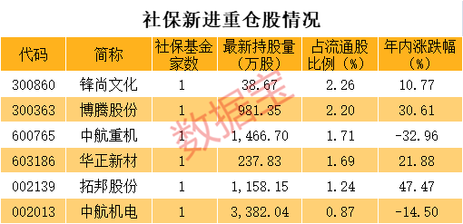 从持股比例看,新进股中社保基金持有比例最多的是锋尚文化,持股量占流通股比例为2.26%,其次是博腾股份(维权),社保基金持股比例为2.20%,持股比例居前的还有中航重机、华正新材、拓邦股份等。
