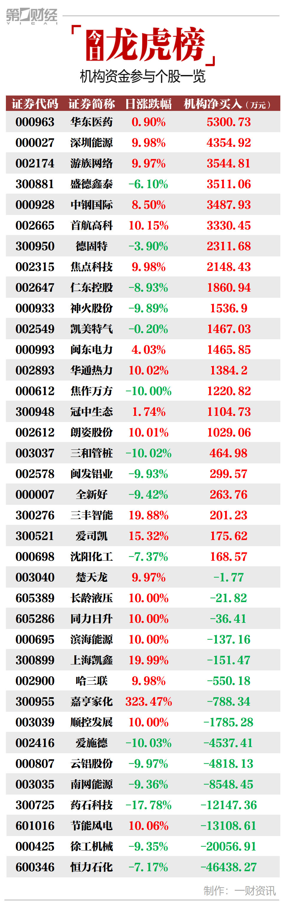 当天机构净买入前三的股票分别是华东医药、深圳能源、游族网络,净买入金额分别是5301万元、4355万元、3545万元。