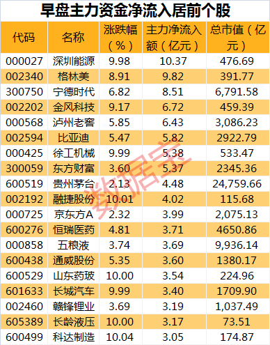 早盘主力资金合计净流入290.13亿元,其中8只个股主力资金净流入超过5亿元,包括深圳能源、格林美、金风科技3只碳中和概念股,深圳能源早盘资金流入10.37亿元。抱团股中,宁德时代、泸州老窖、比亚迪获主力资金净流入居前。