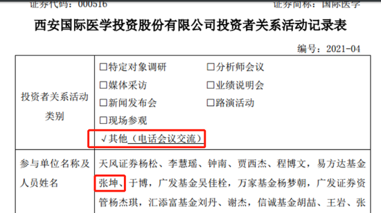 3月24日,国际医学(维权)披露投资者关系活动记录表,本次调研以电话会议的形式交流,其中掌管千亿资产的“公募一哥”张坤赫然在列,这也是他今年首次出现在上市公司调研名单中。除了张坤外,国际医学当天还接受了泓德基金经理于浩成、汇添富基金刘丹、中欧基金贾雅希等70余人的调研。另外,百亿私募星石投资、重阳投资等也均参与了此次调研。