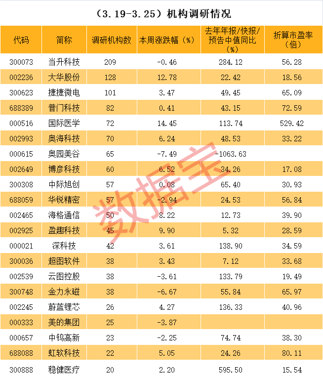 数据宝统计显示,近一周机构调研的上市公司中,根据去年年报、快报、业绩预告净利中值,博彦科技、稳健医疗、杭萧钢构、理邦仪器、金科文化等个股去年净利同比增长超过30%且折算市盈率低于20倍。净利增速方面,稳健医疗、理邦仪器等个股净利增长超过3倍。市盈率角度看,杭萧钢构和理邦仪器市盈率低至15倍以下。