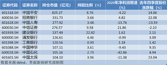 截至去年四季度末证金持仓市值暂居前十的个股名单