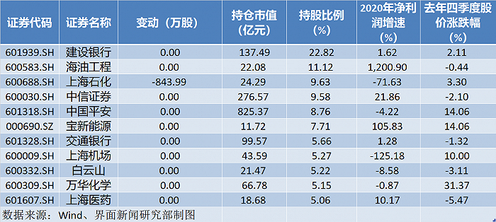 从持仓比例来看,证金持股占流通股比例最高的则是建设银行,合计持股21.89亿股,占流通A股比达到22.82%;紧随其后的是海油工程(600538.SH),去年四季度末持有4.92亿股,占流通股比例为11.12%;上海石化暂居第三位,持股7.06亿股,占比9.63%。