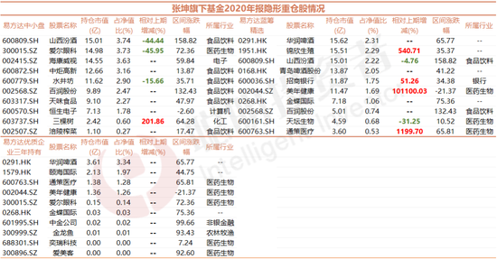 比如,备受市场关注的张坤。2020年报显示,他的4只基金,目前的总持有人户数接近530万;从披露的隐形重仓股来看,张坤新进了华润啤酒、金蝶国际、金龙鱼、中金公司;减持山西汾酒、水井坊,增持三棵树、招商银行;增持锦欣生殖。