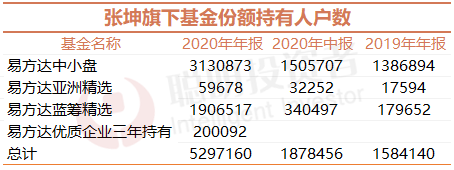 其中,易方达中小盘基金持有人313万,易方达蓝筹精选基金持有人191万,易方达优质企业三年持有投资人20万,易方达亚洲精选投资人6万。
