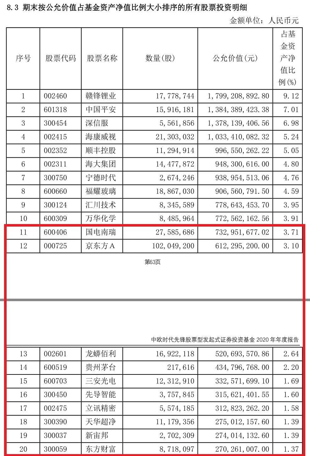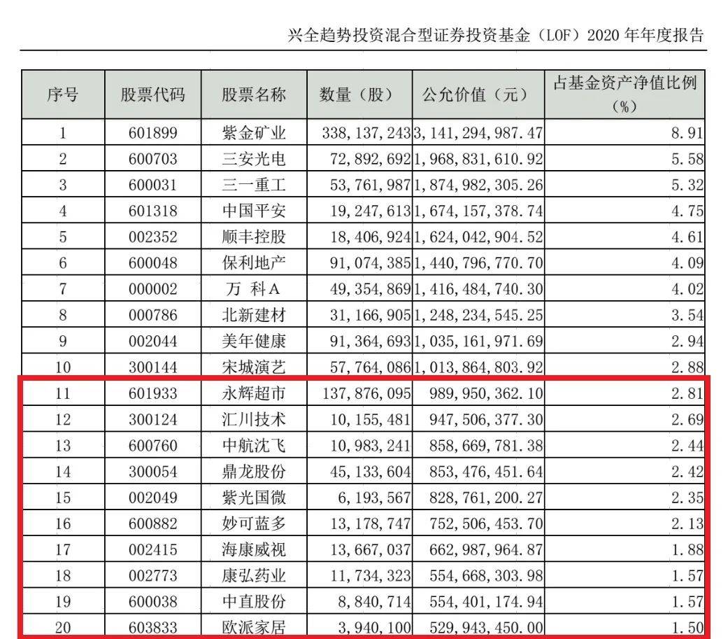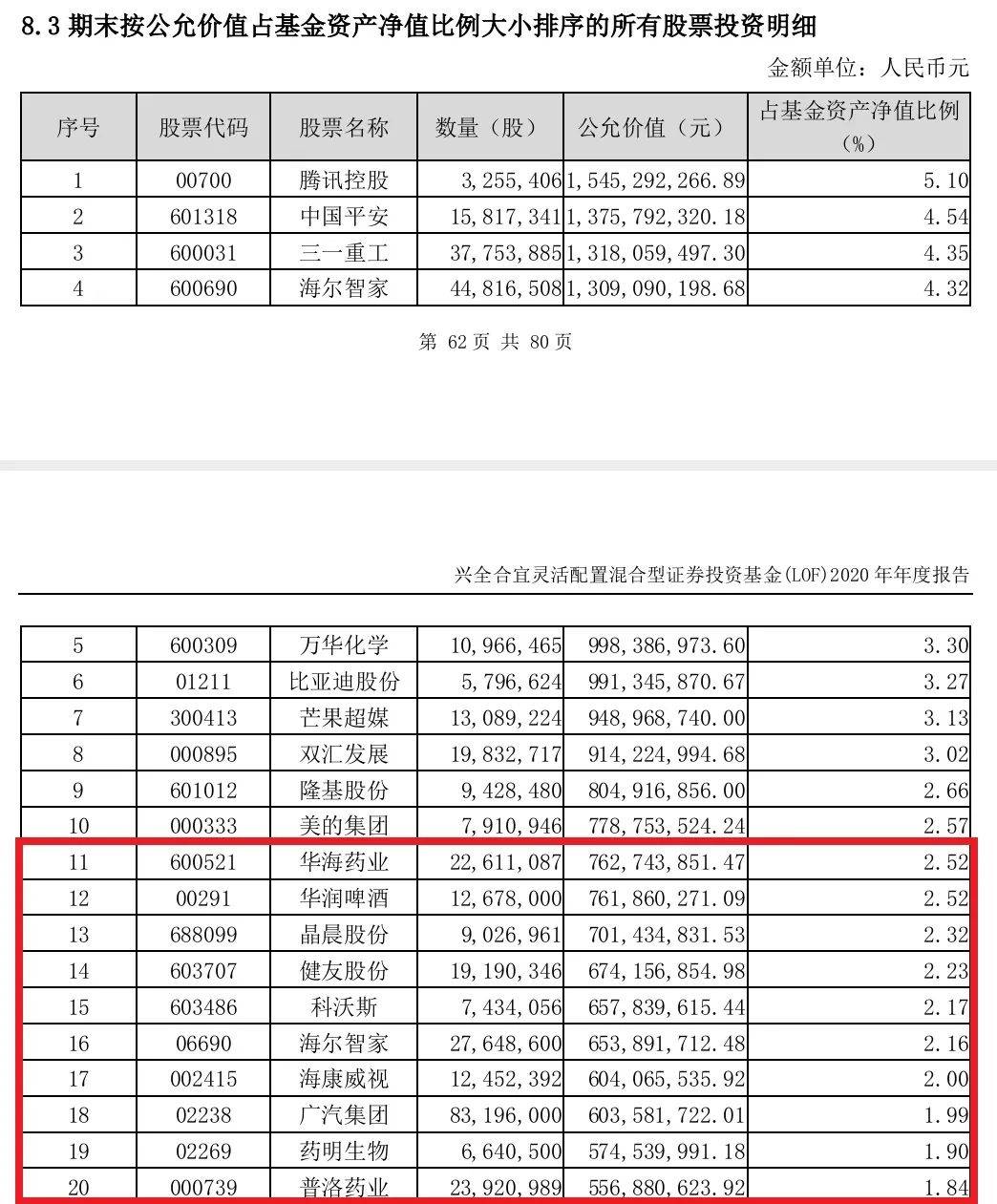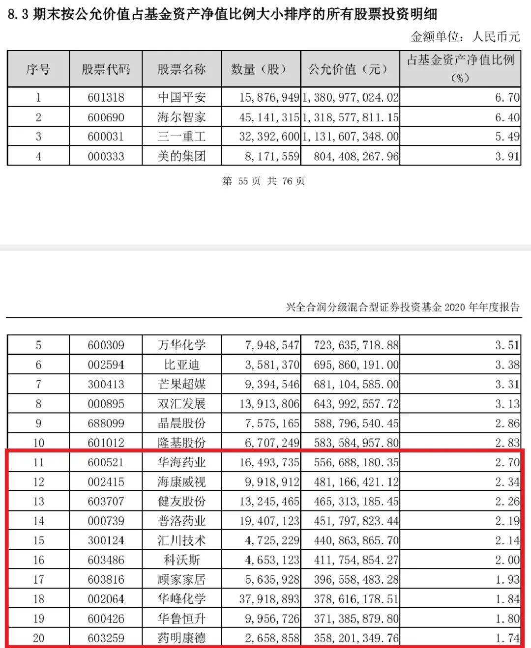 兴全合润基金2020年报显示,除了之前已披露的前十大重仓股,去年四季度末占其持仓组合超过2%的还有华海药业、海康威视、健友股份、普洛药业、汇川技术、科沃斯6只个股。第11——第20大重仓股合计占兴全合润净值比重超过20%,可以称得上谢治宇的隐型重仓股。