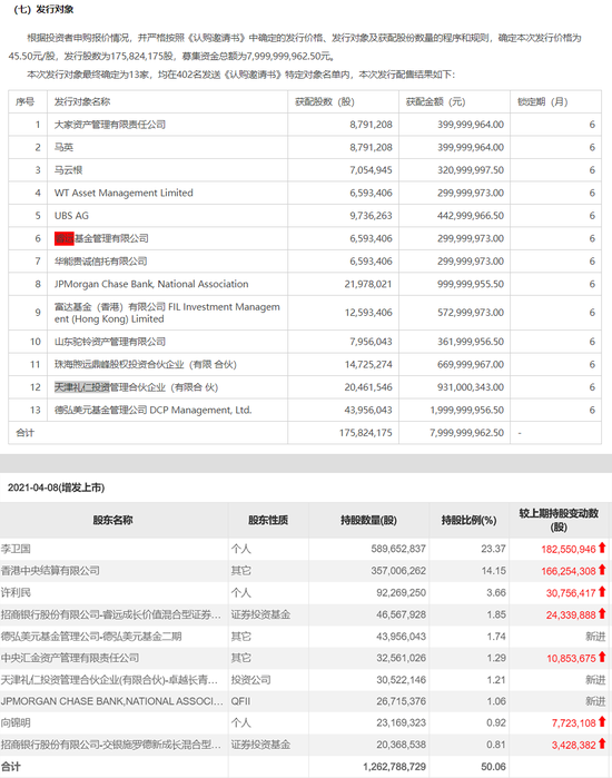 4月 1日晚间,建筑防水龙头——东方雨虹近80亿元定增获配名单出炉。此次定增发行价格为45.5元/股,相当于定价基准日(2021年3月2日)收盘价49.8元/股的91.36%,发行股数为1.76亿股。其中,天津礼仁投资管理合伙企业(有限合伙)和睿远基金分别获配2046万股和659万股,获配金额分别为9.3亿元和3亿元。