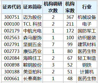 机构调研次数来看,坚朗五金机构调研最为密集,共获机构7次调研。莱宝高科、鞍钢股份等机构调研也较为密集,均被机构调研3次。