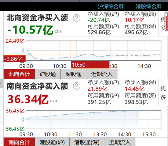 北向资金全天净卖出10.57亿元,其中沪股通净卖出20.74亿元,深股通净买入10.17亿元。